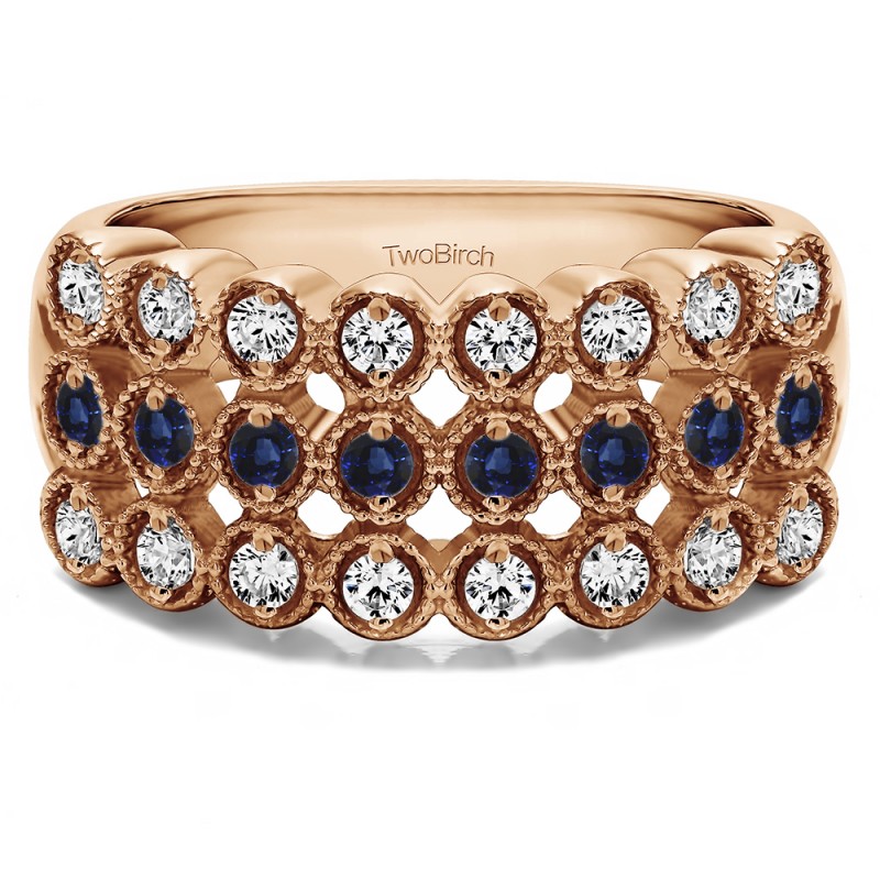 This wedding ring features 24 round bezel set stones with a 2 millimeter wide band. The total combined carat weight of the ring is 0.72 carats. The bezels in this design are millgrained. This wedding ring weighs approximately 8.65 grams.