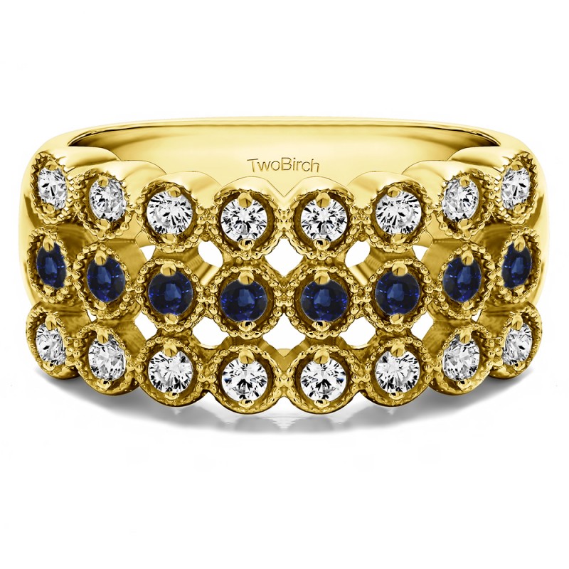 This wedding ring features 24 round bezel set stones with a 2 millimeter wide band. The total combined carat weight of the ring is 0.72 carats. The bezels in this design are millgrained. This wedding ring weighs approximately 8.65 grams.