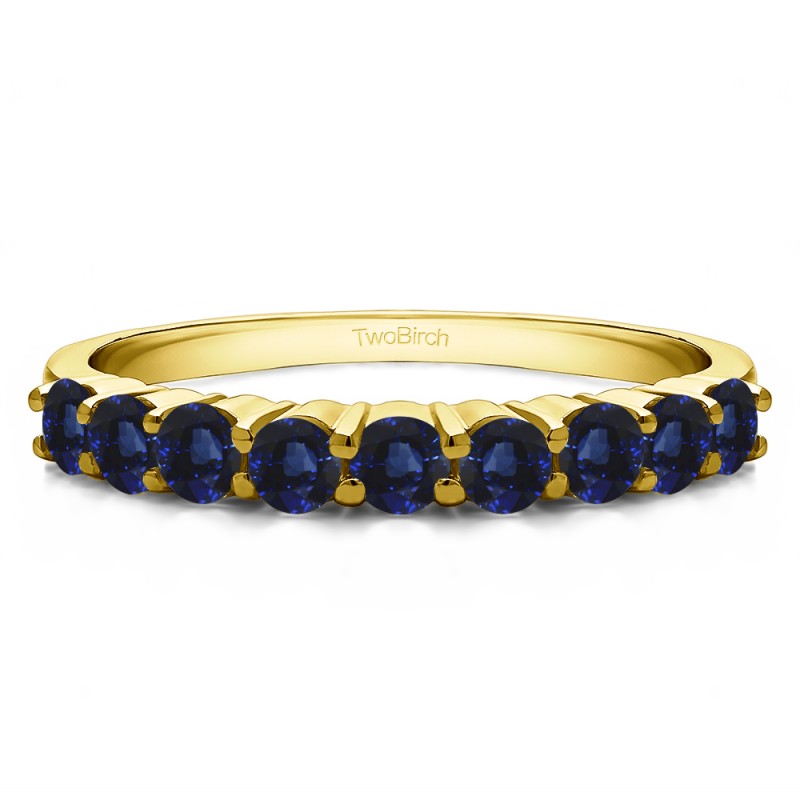 This wedding ring features 9 round prong set stones with a 2 millimeter wide band. The total combined carat weight of the ring is 0.75 carats. It features a double row of shared prong set round stones. This wedding ring weighs approximately 2.79 grams.