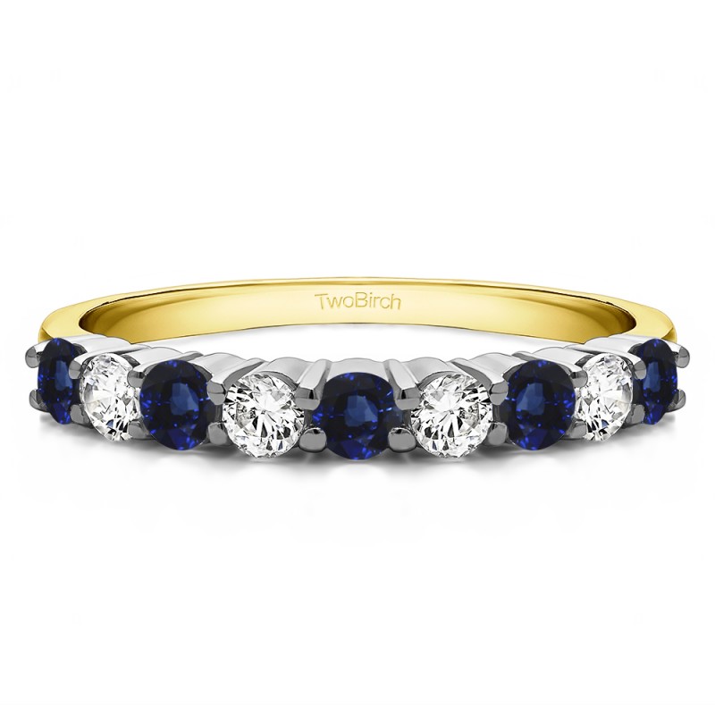 This wedding ring features 9 round prong set stones with a 2 millimeter wide band. The total combined carat weight of the ring is 0.75 carats. It features a double row of shared prong set round stones. This wedding ring weighs approximately 2.79 grams.