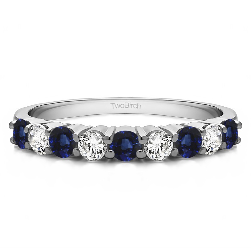 This wedding ring features 9 round prong set stones with a 2 millimeter wide band. The total combined carat weight of the ring is 0.75 carats. It features a double row of shared prong set round stones. This wedding ring weighs approximately 2.79 grams.