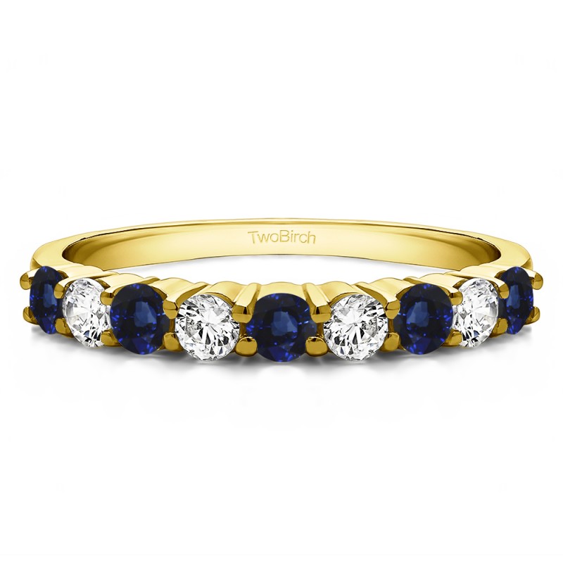 This wedding ring features 9 round prong set stones with a 2 millimeter wide band. The total combined carat weight of the ring is 0.75 carats. It features a double row of shared prong set round stones. This wedding ring weighs approximately 2.79 grams.