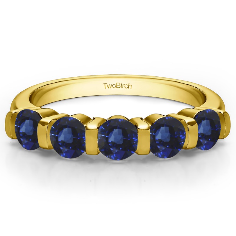This wedding ring features 5 round bar set stones with a 2 millimeter wide band. The total combined carat weight of the ring is 0.75 carats. Stones are set in a high polished bar, giving it both stability and grace. This wedding ring weighs approximately 3.1 grams.