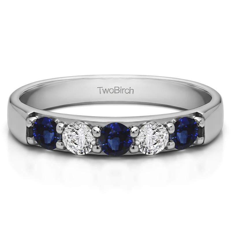 This wedding ring features 5 round prong set stones with a 2 millimeter wide band. The total combined carat weight of the ring is 0.75 carats. Stones in this wedding ring are set low, making it a perfect match for most engagement rings. It is also wide enough to be worn on its own, without any engagement ring. This wedding ring weighs approximately 4.56 grams.