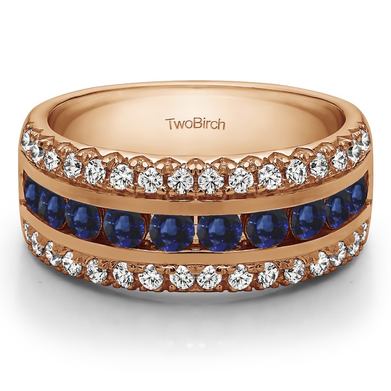 This wedding ring features 42 round prong set stones with a 2 millimeter wide band. The total combined carat weight of the ring is 0.75 carats. It features three rows of stones. This wedding ring weighs approximately 9.63 grams.