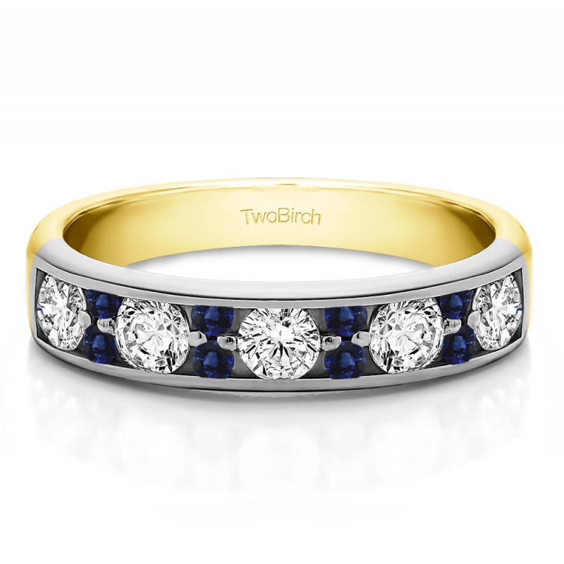 This wedding ring features 13 round channel set stones with a 2 millimeter wide band. The total combined carat weight of the ring is 0.76 carats. It has large round stones accented with smaller stones in between. This wedding ring weighs approximately 4.95 grams.