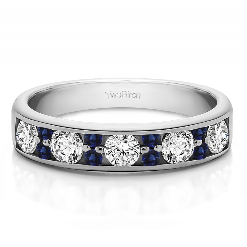 This wedding ring features 13 round channel set stones with a 2 millimeter wide band. The total combined carat weight of the ring is 0.76 carats. It has large round stones accented with smaller stones in between. This wedding ring weighs approximately 4.95 grams.
