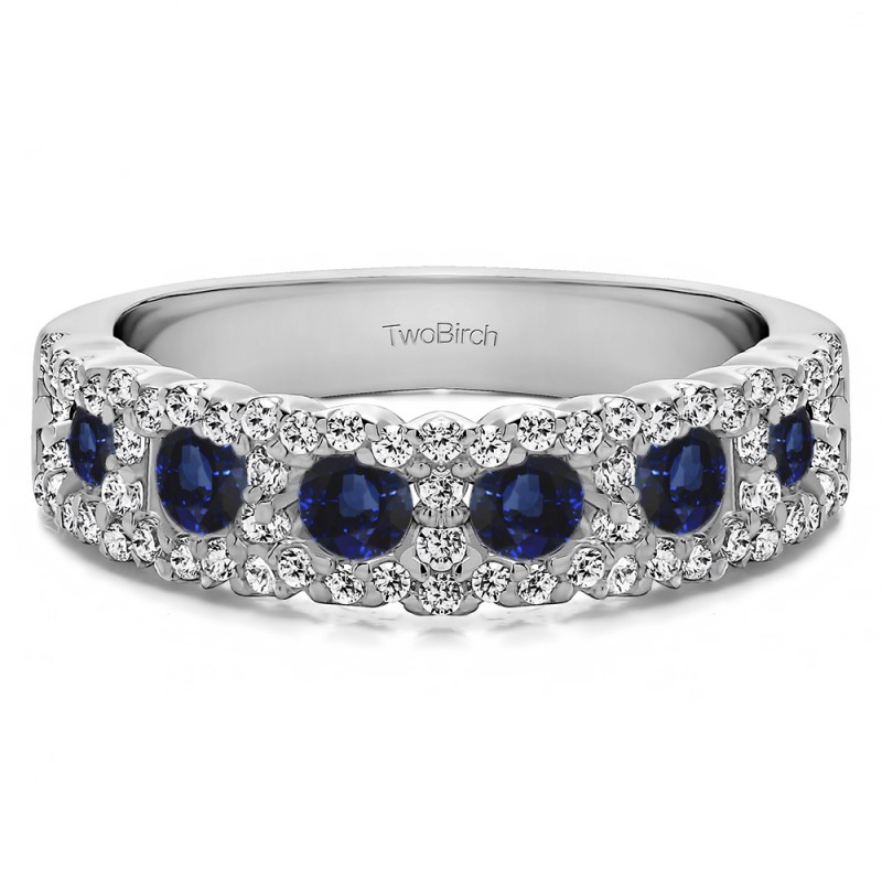 This wedding ring features 70 round prong set stones with a 2 millimeter wide band. The total combined carat weight of the ring is 0.84 carats. The six main stones are accented with smaller round stones on each side. This wedding ring weighs approximately 5.18 grams.