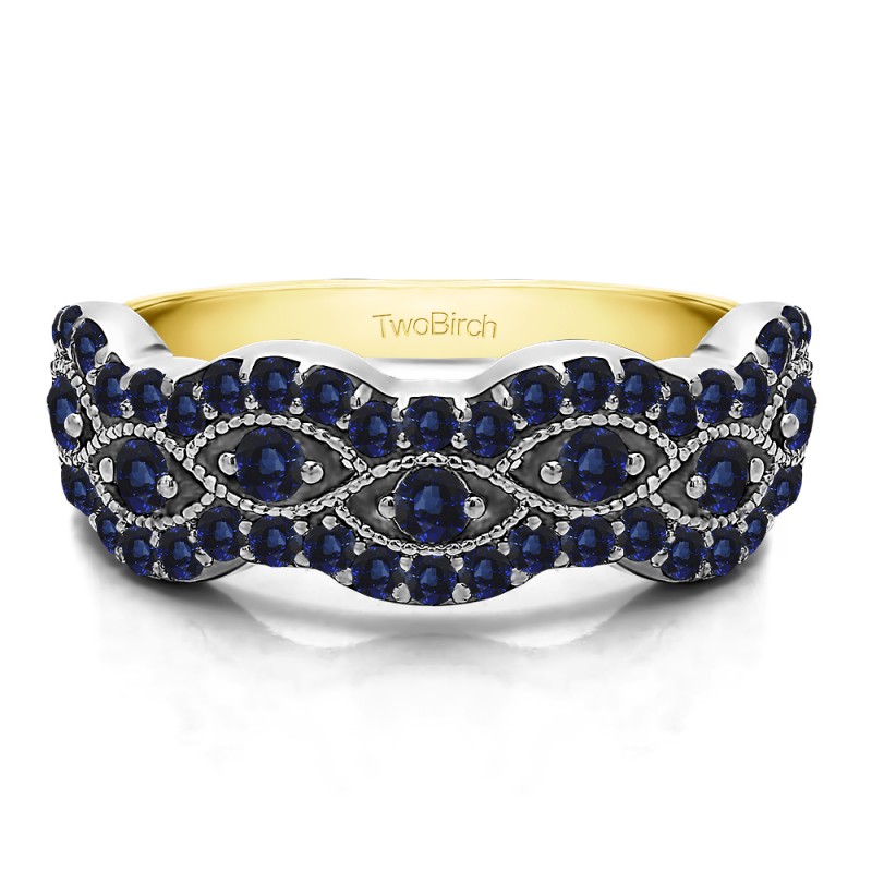 This wedding ring features 49 round prong set stones with a 2 millimeter wide band. The total combined carat weight of the ring is 0.88 carats. It features pave set stones with millgraining and infinity designs. This wedding ring weighs approximately 5.19 grams.