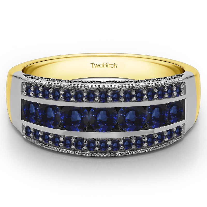This wedding ring features 39 round channel set stones with a 2 millimeter wide band. The total combined carat weight of the ring is 0.98 carats. It has three rows of stones, channel and prong set with millgrained edges. This wedding ring weighs approximately 8.24 grams.