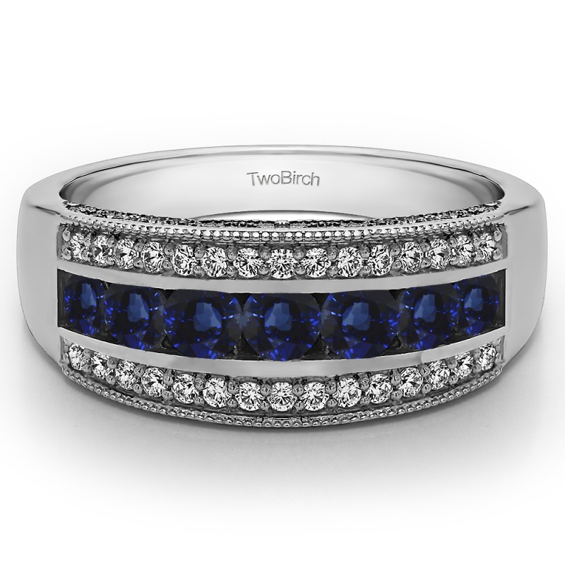 This wedding ring features 39 round channel set stones with a 2 millimeter wide band. The total combined carat weight of the ring is 0.98 carats. It has three rows of stones, channel and prong set with millgrained edges. This wedding ring weighs approximately 8.24 grams.