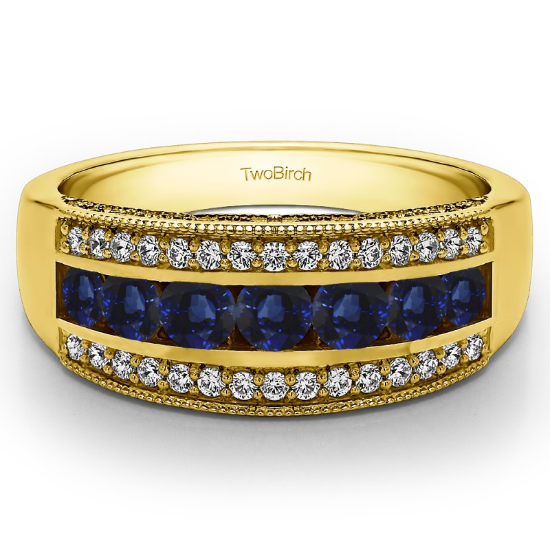 This wedding ring features 39 round channel set stones with a 2 millimeter wide band. The total combined carat weight of the ring is 0.98 carats. It has three rows of stones, channel and prong set with millgrained edges. This wedding ring weighs approximately 8.24 grams.