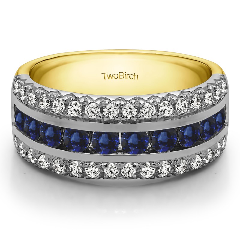 This wedding ring features 42 round prong set stones with a 2 millimeter wide band. The total combined carat weight of the ring is 0.98 carats. It features three rows of stones. This wedding ring weighs approximately 10.28 grams.