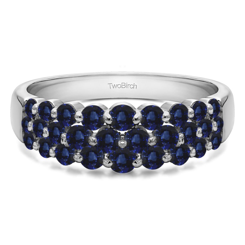 This wedding ring features 28 round prong set stones with a 2 millimeter wide band. The total combined carat weight of the ring is 0.99 carats. It has three rows of common prong set round stones. This wedding ring weighs approximately 4.61 grams.