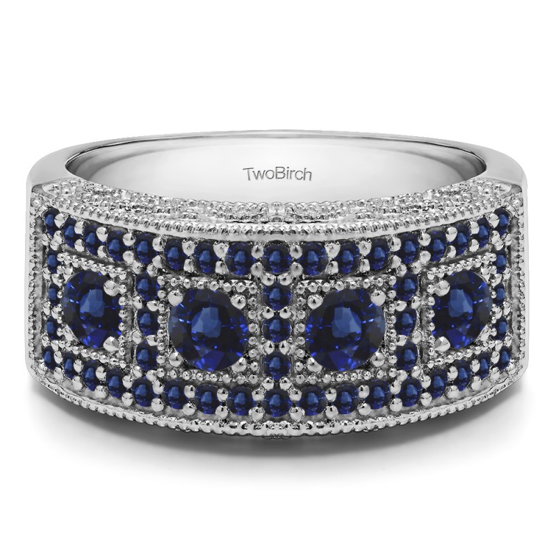 This wedding ring features 53 round prong set stones with a 2 millimeter wide band. The total combined carat weight of the ring is 1.01 carats. It has four larger stones with smaller stones surrounding them. It also features millgrained edges and filigree design. This wedding ring weighs approximately 10.76 grams.