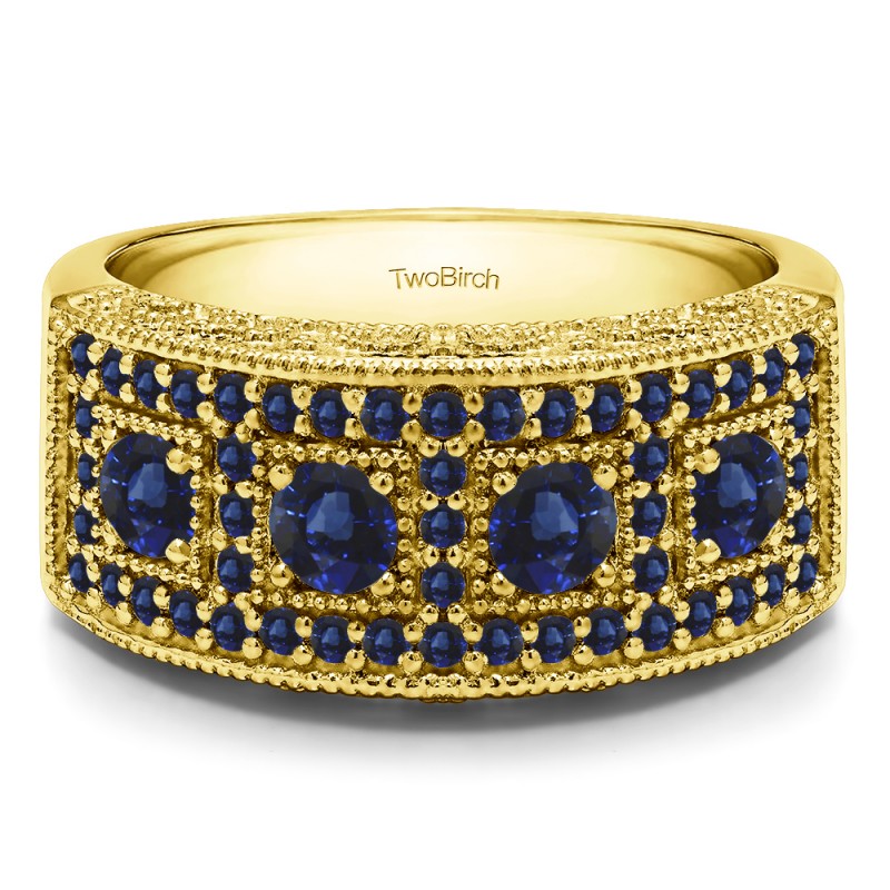 This wedding ring features 53 round prong set stones with a 2 millimeter wide band. The total combined carat weight of the ring is 1.01 carats. It has four larger stones with smaller stones surrounding them. It also features millgrained edges and filigree design. This wedding ring weighs approximately 10.76 grams.
