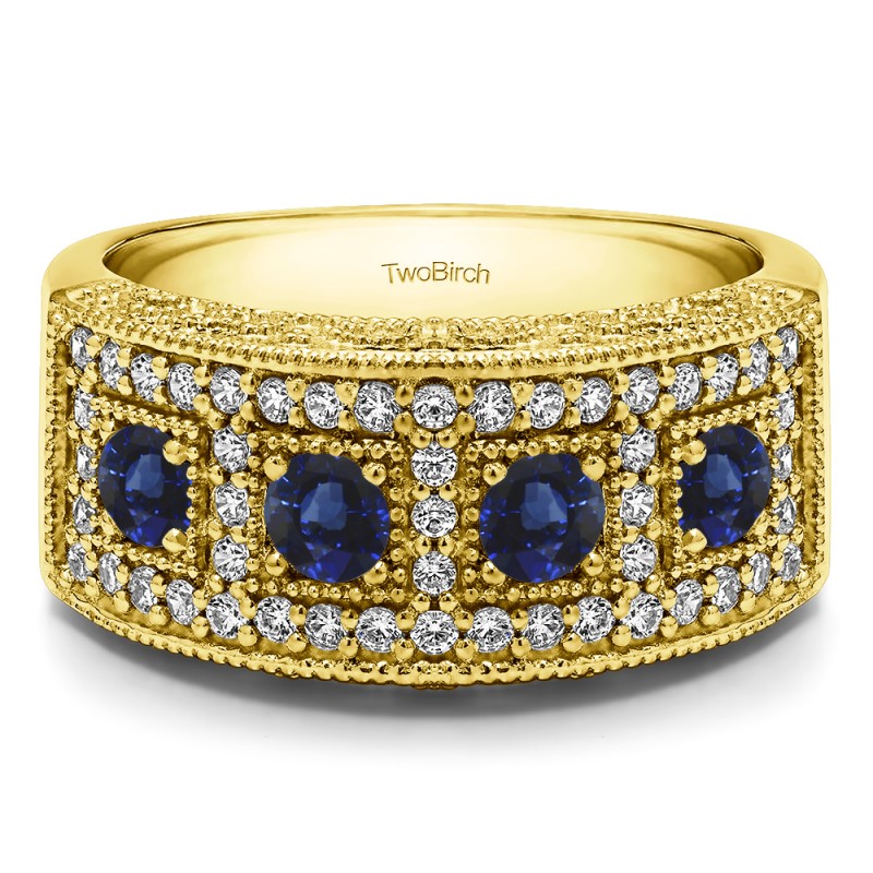 This wedding ring features 53 round prong set stones with a 2 millimeter wide band. The total combined carat weight of the ring is 1.01 carats. It has four larger stones with smaller stones surrounding them. It also features millgrained edges and filigree design. This wedding ring weighs approximately 10.76 grams.