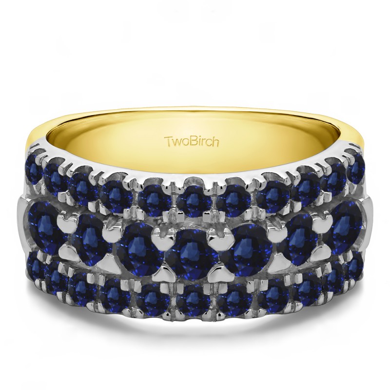 This wedding ring features 29 round prong set stones with a 2 millimeter wide band. The total combined carat weight of the ring is 1.21 carats. It has one wide row of stones surrounded by one row of smaller stones on each side. This wedding ring weighs approximately 7.38 grams.