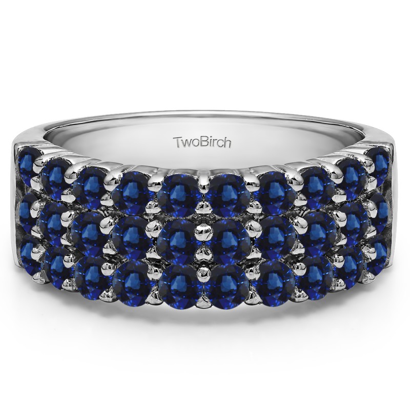 This wedding ring features 30 round prong set stones with a 2 millimeter wide band. The total combined carat weight of the ring is 1.5 carats. It has three rows of common prong stones. This wedding ring weighs approximately 6.39 grams.