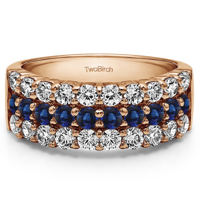 This wedding ring features 30 round prong set stones with a 2 millimeter wide band. The total combined carat weight of the ring is 1.5 carats. It has three rows of common prong stones. This wedding ring weighs approximately 6.39 grams.