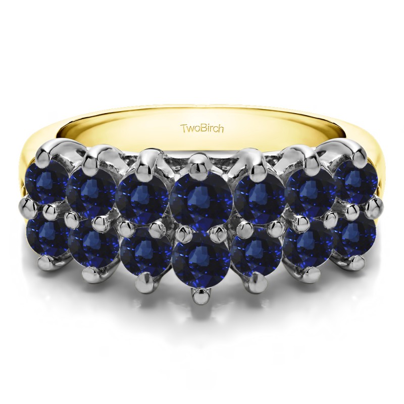 This wedding ring features 14 round prong set stones with a 2 millimeter wide band. The total combined carat weight of the ring is 1.96 carats. Two rows of double shared prongs making this anniversary band both durable and stunning. This wedding ring weighs approximately 6.2 grams.