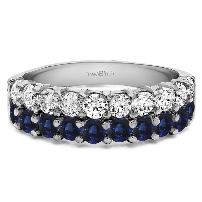 This wedding ring features 20 round prong set stones with a 2 millimeter wide band. The total combined carat weight of the ring is 1 carats. This ring has a double row of shared prong stones. This wedding ring weighs approximately 4.79 grams.