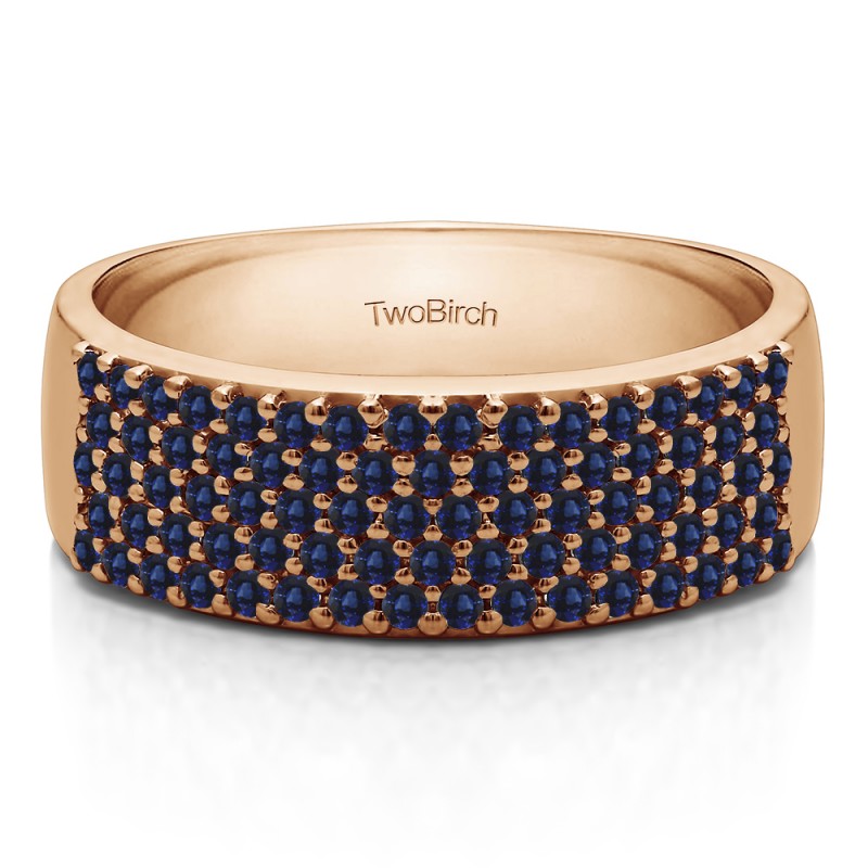 This wedding ring features 1 round prong set stones with a 2 millimeter wide band. The total combined carat weight of the ring is 1 carats. It has a double row of round stones set with shared prongs. This wedding ring weighs approximately 7 grams.