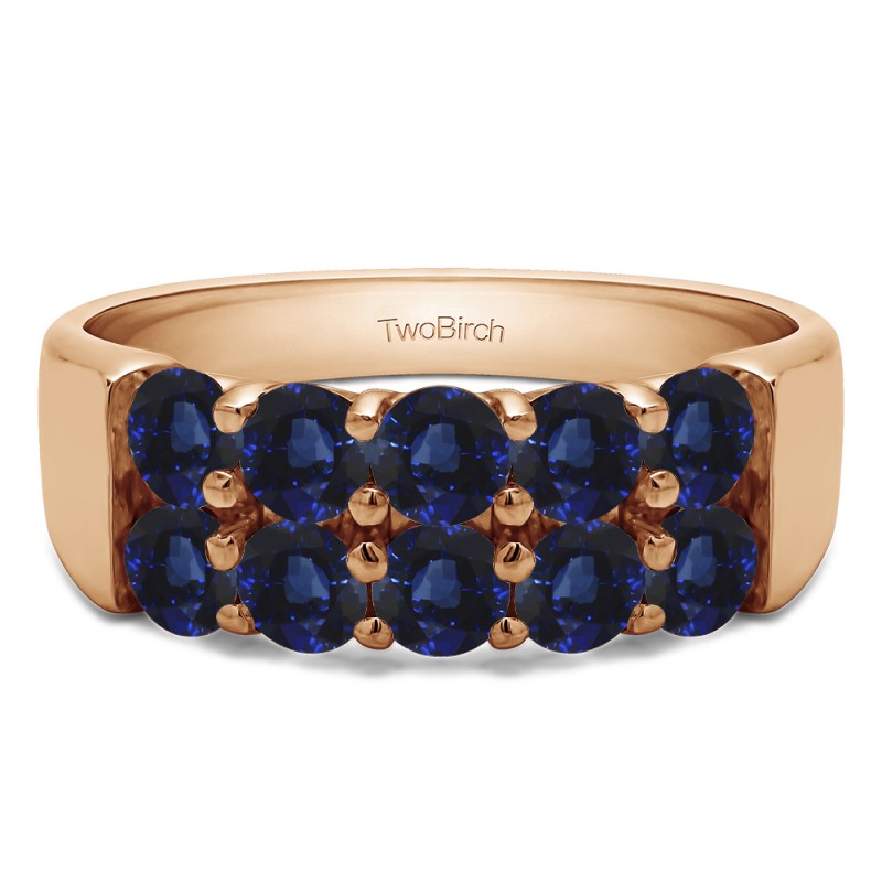 This wedding ring features 10 round prong set stones with a 2 millimeter wide band. The total combined carat weight of the ring is 1 carats. This ring has a double row of shared prong stones. This wedding ring weighs approximately 6.55 grams.