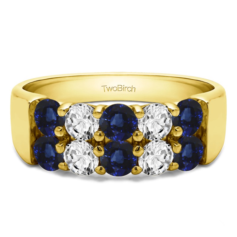 This wedding ring features 10 round prong set stones with a 2 millimeter wide band. The total combined carat weight of the ring is 1 carats. This ring has a double row of shared prong stones. This wedding ring weighs approximately 6.55 grams.