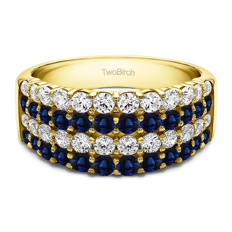 This wedding ring features 48 round prong set stones with a 9.5 millimeter wide band. The total combined carat weight of the ring is 2.04 carats. It has four rows of double shared prong stones. This wedding ring weighs approximately 9.58 grams.