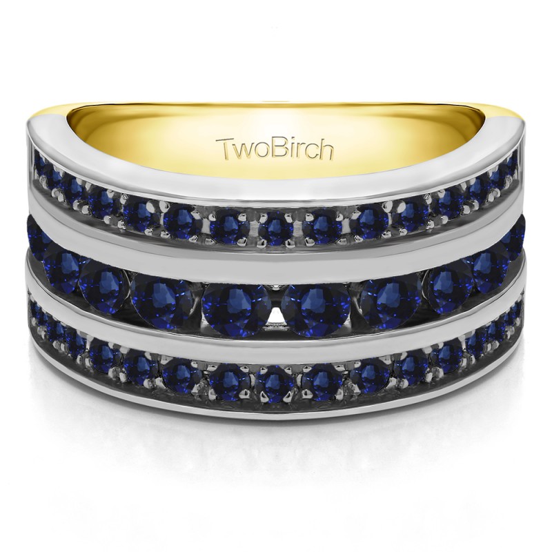 This wedding ring features 40 round channel set stones with a 2 millimeter wide band. The total combined carat weight of the ring is 2 carats. This band is very wide and features three rows of channel set stones. This wedding ring weighs approximately 14.69 grams.