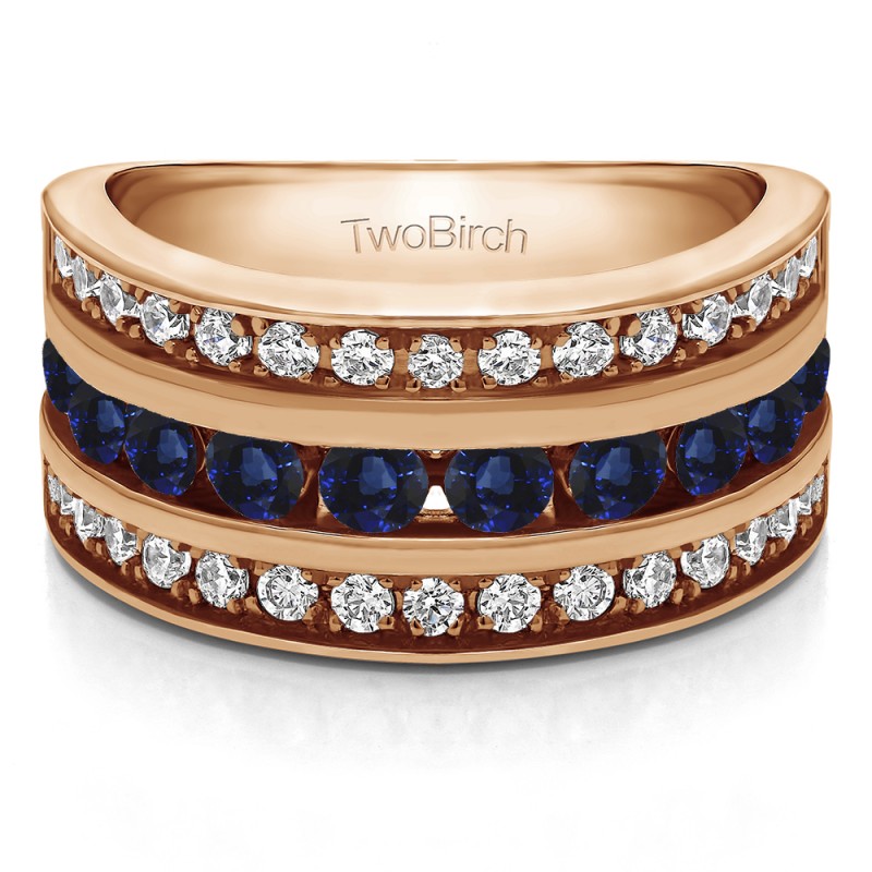 This wedding ring features 40 round channel set stones with a 2 millimeter wide band. The total combined carat weight of the ring is 2 carats. This band is very wide and features three rows of channel set stones. This wedding ring weighs approximately 14.69 grams.
