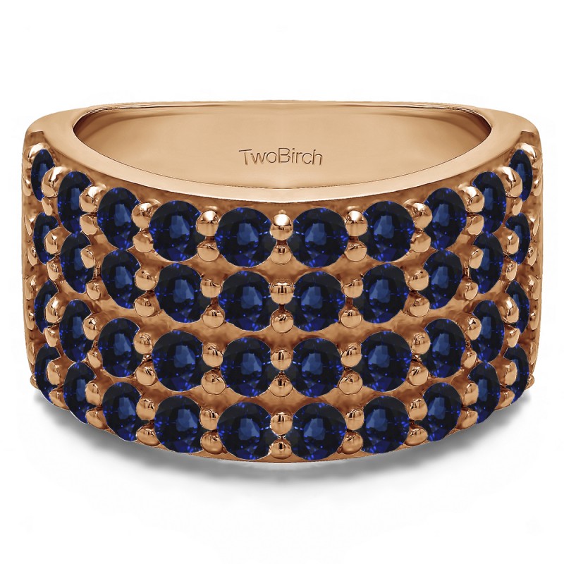 This wedding ring features 40 round prong set stones with a 2 millimeter wide band. The total combined carat weight of the ring is 2 carats. It features four rows of round shared prong set stones. This wedding ring weighs approximately 17.49 grams.