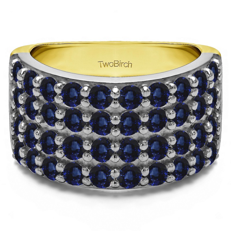 This wedding ring features 40 round prong set stones with a 2 millimeter wide band. The total combined carat weight of the ring is 2 carats. It features four rows of round shared prong set stones. This wedding ring weighs approximately 17.49 grams.