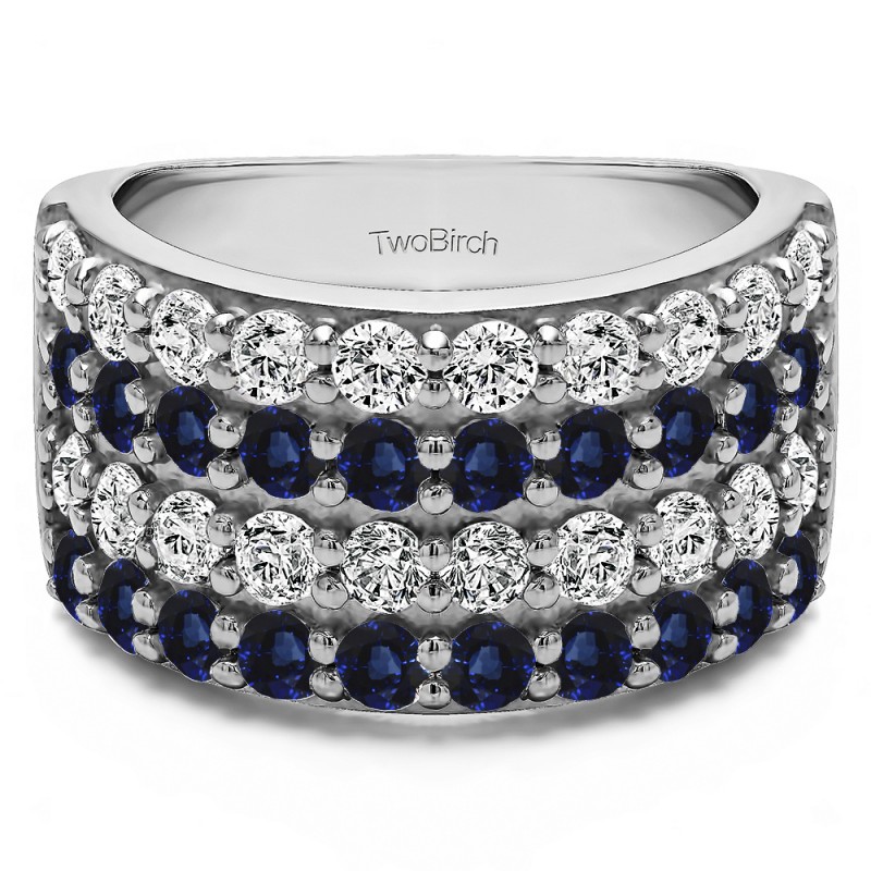 This wedding ring features 40 round prong set stones with a 2 millimeter wide band. The total combined carat weight of the ring is 2 carats. It features four rows of round shared prong set stones. This wedding ring weighs approximately 17.49 grams.