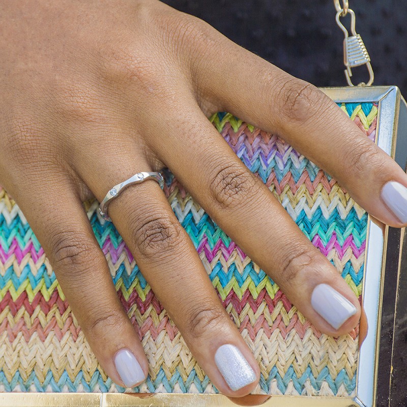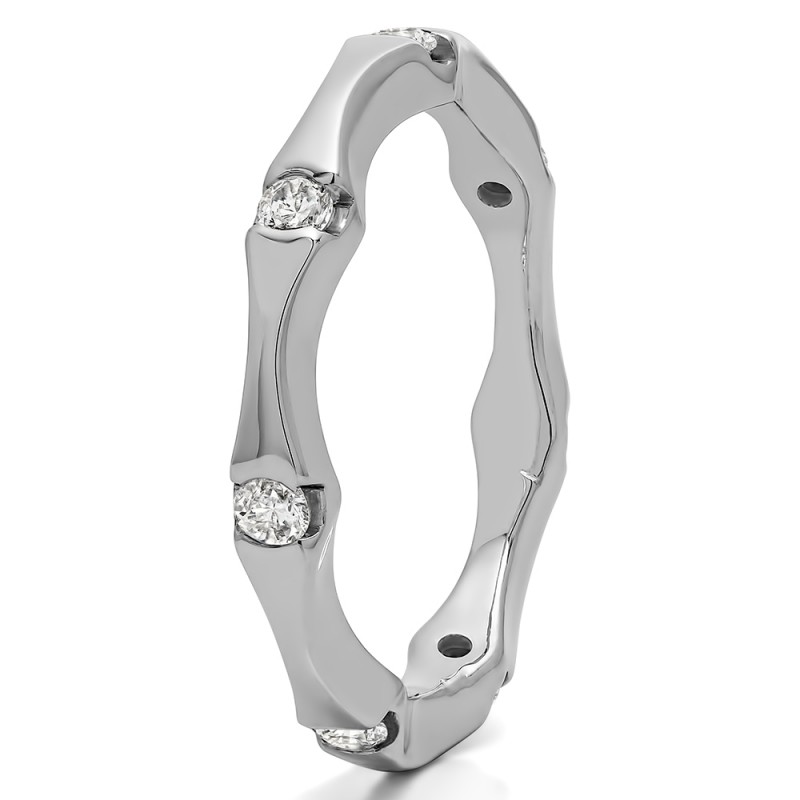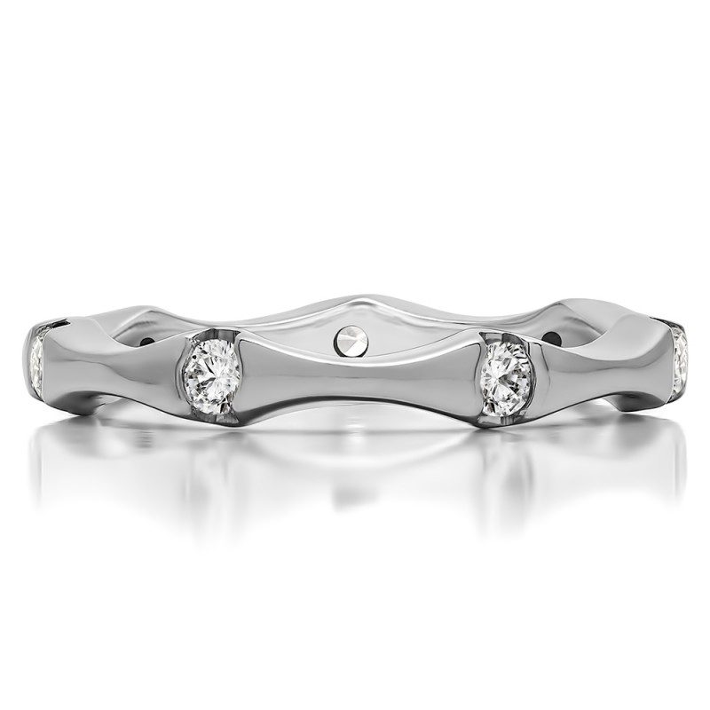 This wedding ring features 7 round bezel set stones with a 2 millimeter wide band. The total combined carat weight of the ring is 0.25 carats. It has stones spaced throughout the entirety of the band. This wedding ring weighs approximately 2.59 grams.