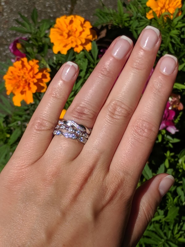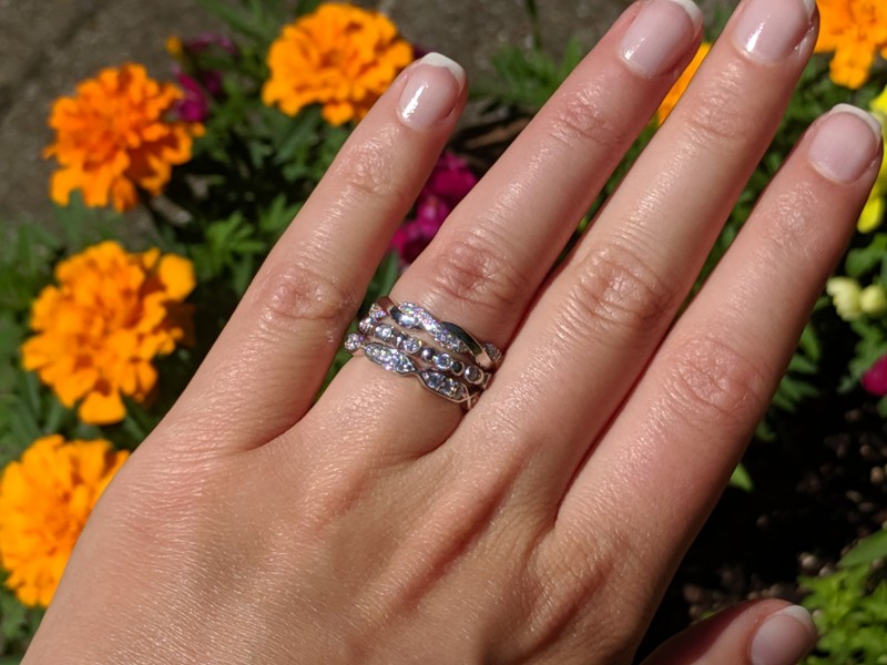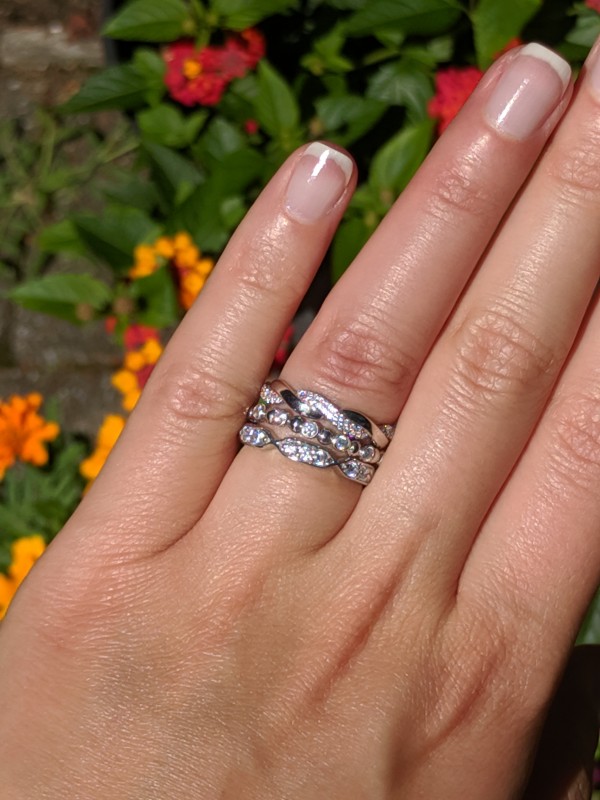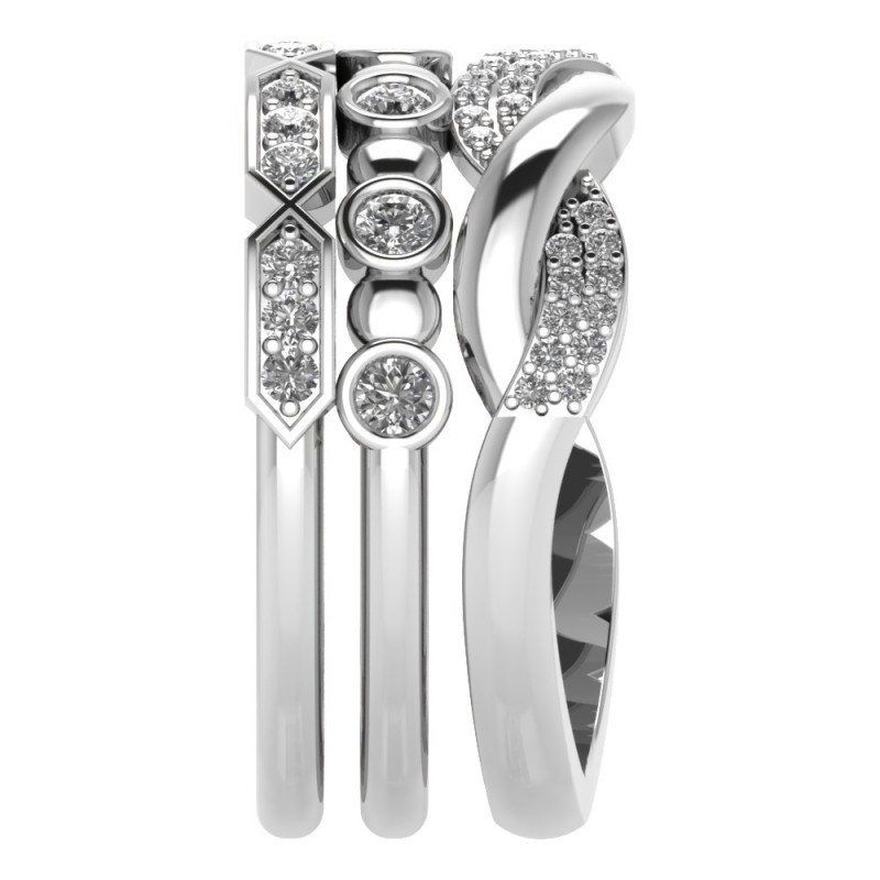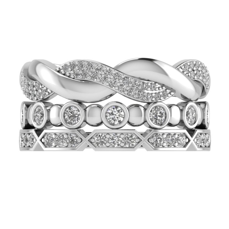 This ring stack features three rings. The first band features a stunning 2/5 carat diamond band, then a prong set .16 carat band, and finally a .14 carat diamond band. All three rings are made in solid metal and can be worn in any order. The diamonds in this stack have G to H color with I2 to I3 clarity. If you select moissanite, it will G to H color with VVS clarity. The total carat weight of this stack is .73 carats.
