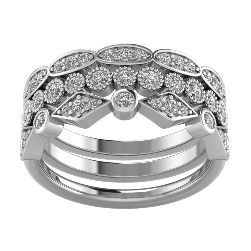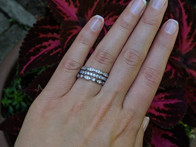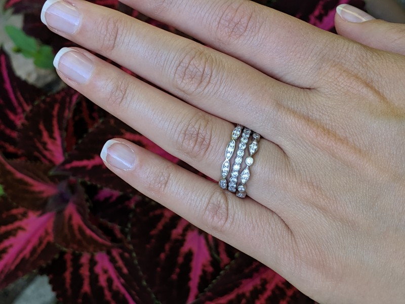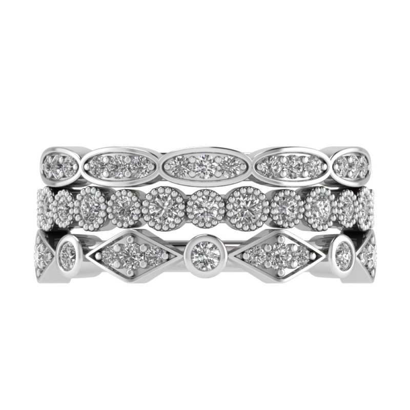 This ring stack features three rings. The first band features a stunning 1/5 carat band, then a prong set .39 carat band, and finally a .13 carat band. All three rings are made in solid meta and can be worn in any order. The diamonds in this stack have G to H color with I2 to I3 clarity. If you select moissanite, it will G to H color with VVS clarity. The total carat weight of this stack is .83 carats.