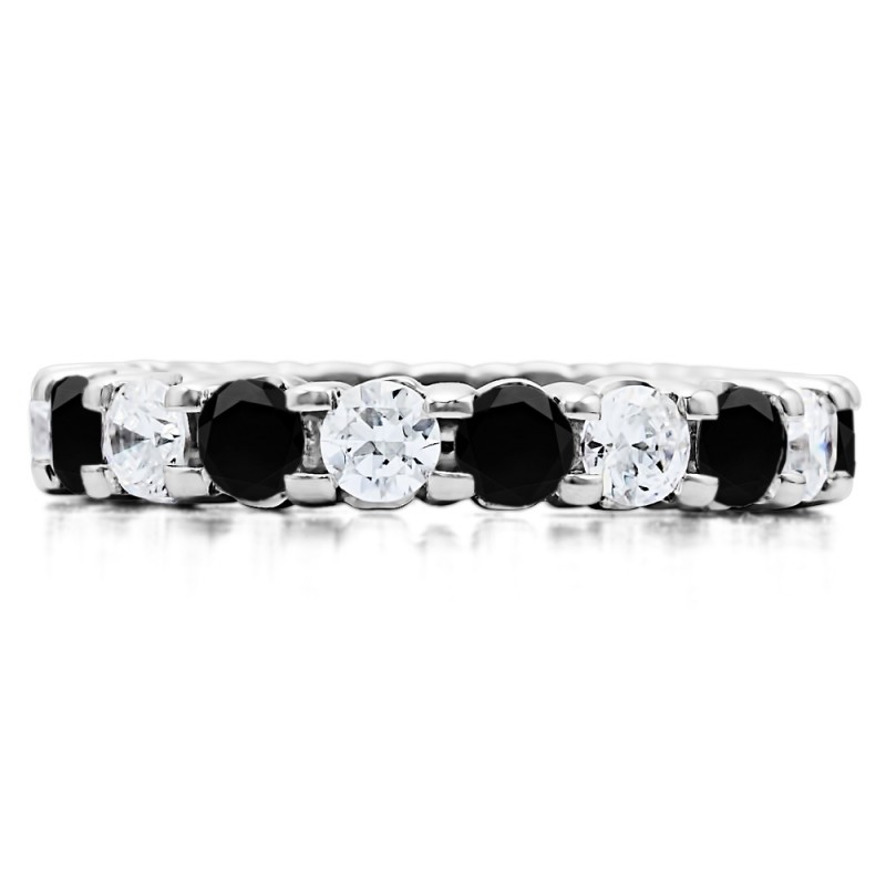 This eternity band is classic and timeless, featuring a continual band of round stones, set with double shared prongs. This makes for the perfect anniversary or wedding band.