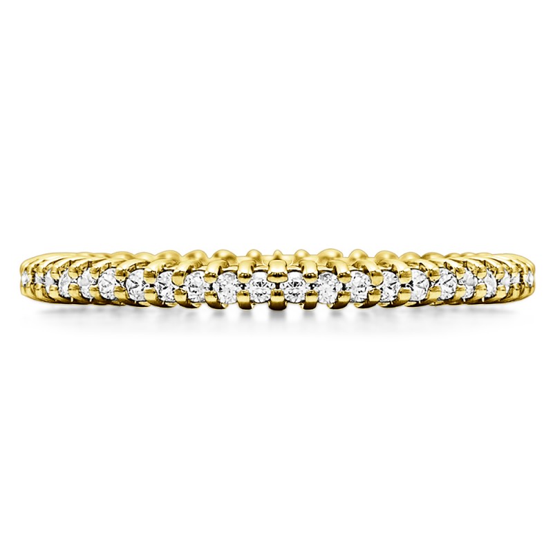 This eternity band is classic and timeless, featuring a continual band of round stones, set with double shared prongs. This makes for the perfect anniversary or wedding band.
