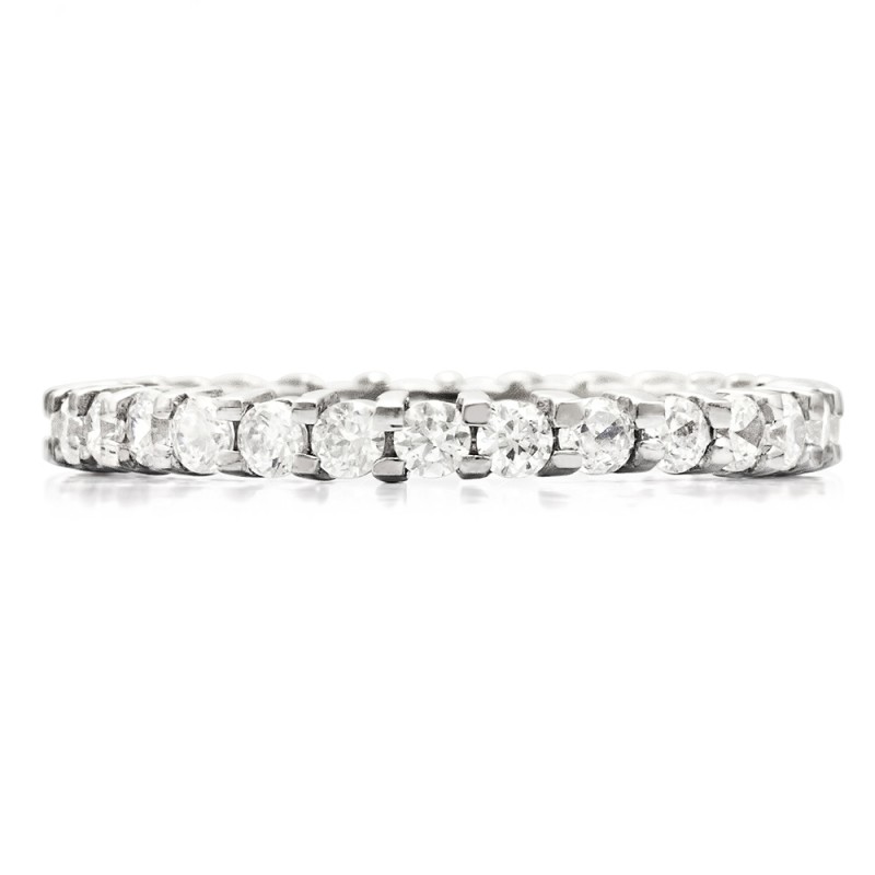 This eternity band is classic and timeless, featuring a continual band of round stones, set with double shared prongs. This makes for the perfect anniversary or wedding band.