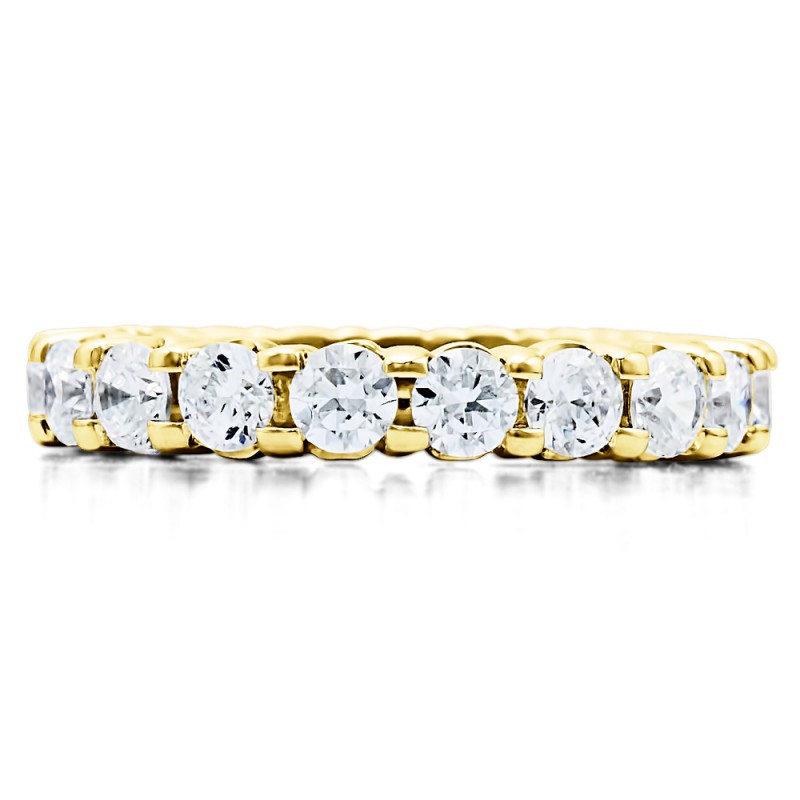This eternity band is classic and timeless, featuring a continual band of round stones, set with double shared prongs. This makes for the perfect anniversary or wedding band.