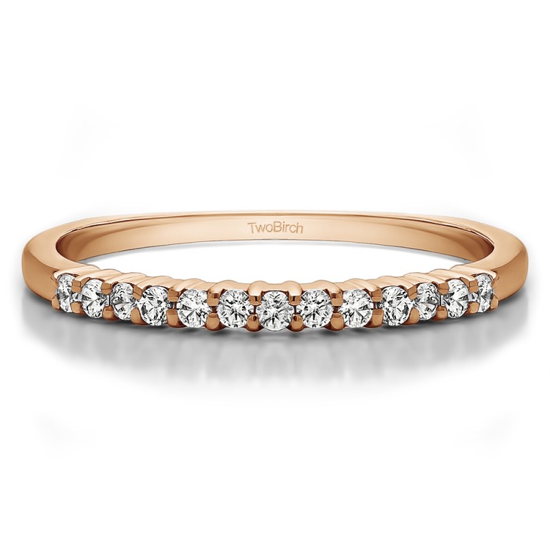 This wedding ring features 13 round prong set stones with a 2 millimeter wide band. The total combined carat weight of the ring is 0.25 carats. It features a double row of shared prong set round stones. This wedding ring weighs approximately 3.17 grams.