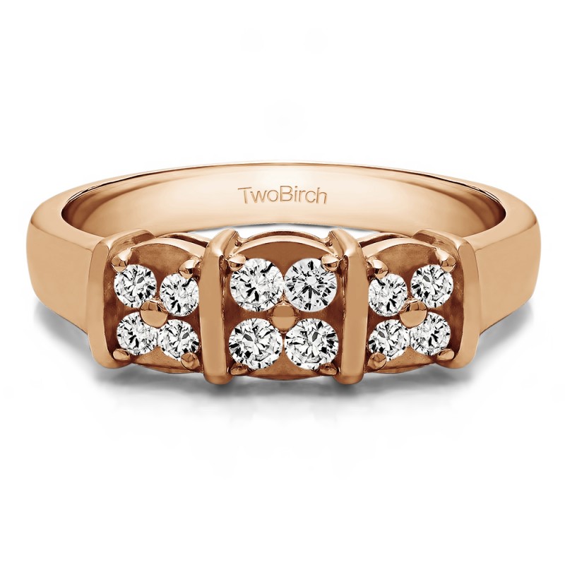 This wedding ring features 12 round bar set stones with a 2 millimeter wide band. The total combined carat weight of the ring is 0.31 carats. It is set in a way that gives the stones the appearance of a flower. This wedding ring weighs approximately 4.45 grams.