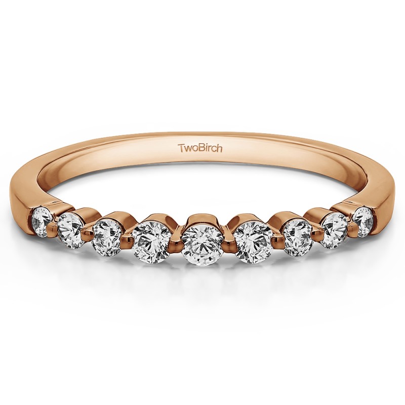 This wedding ring features 9 round bezel set stones with a 2 millimeter wide band. The total combined carat weight of the ring is 0.33 carats. It has a pinched shank and stones set with a shared prong. This wedding ring weighs approximately 2.75 grams.