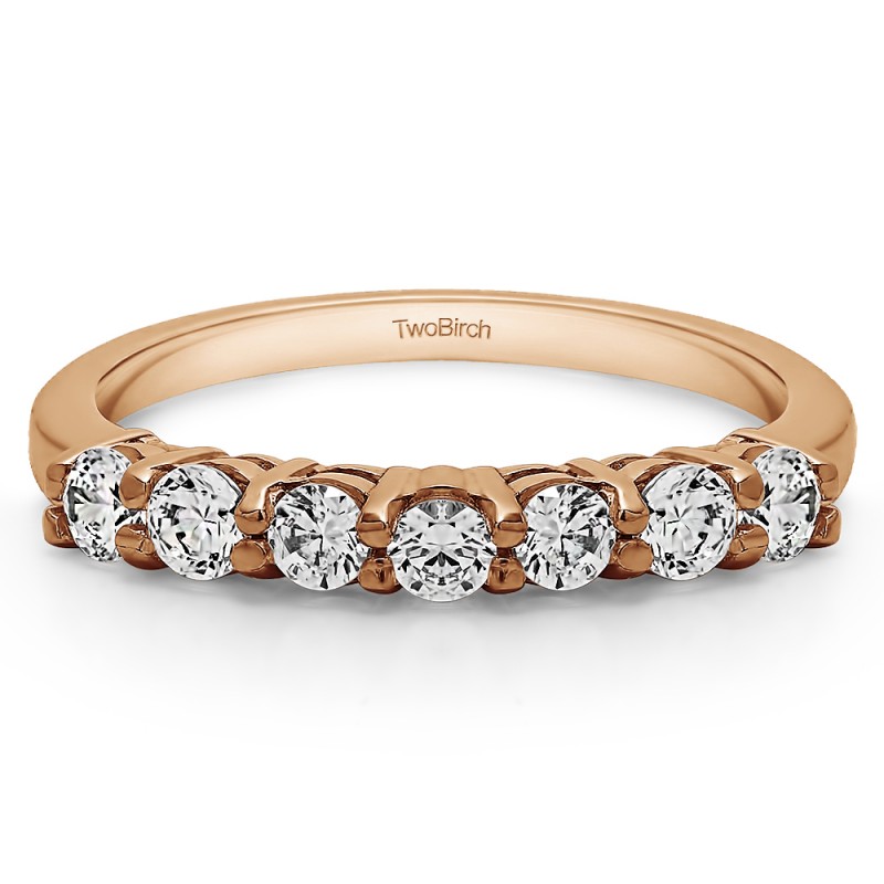 This wedding ring features 7 round prong set stones with a 2 millimeter wide band. The total combined carat weight of the ring is 0.42 carats. It has basket style settings. This wedding ring weighs approximately 2.79 grams.