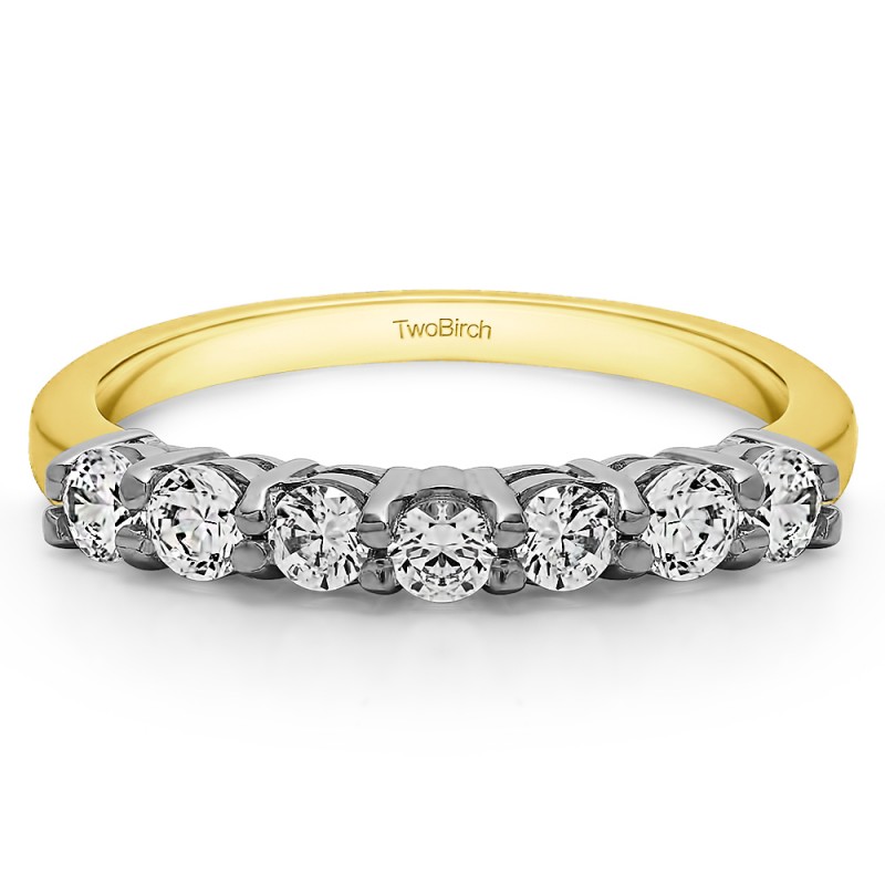 This wedding ring features 7 round prong set stones with a 2 millimeter wide band. The total combined carat weight of the ring is 0.42 carats. It has basket style settings. This wedding ring weighs approximately 2.79 grams.