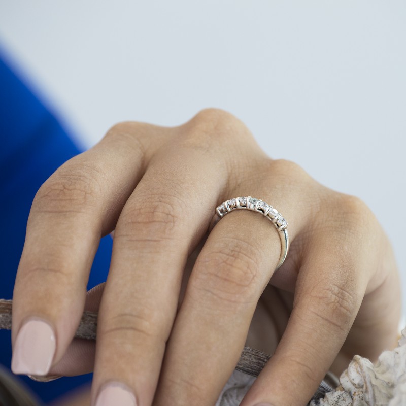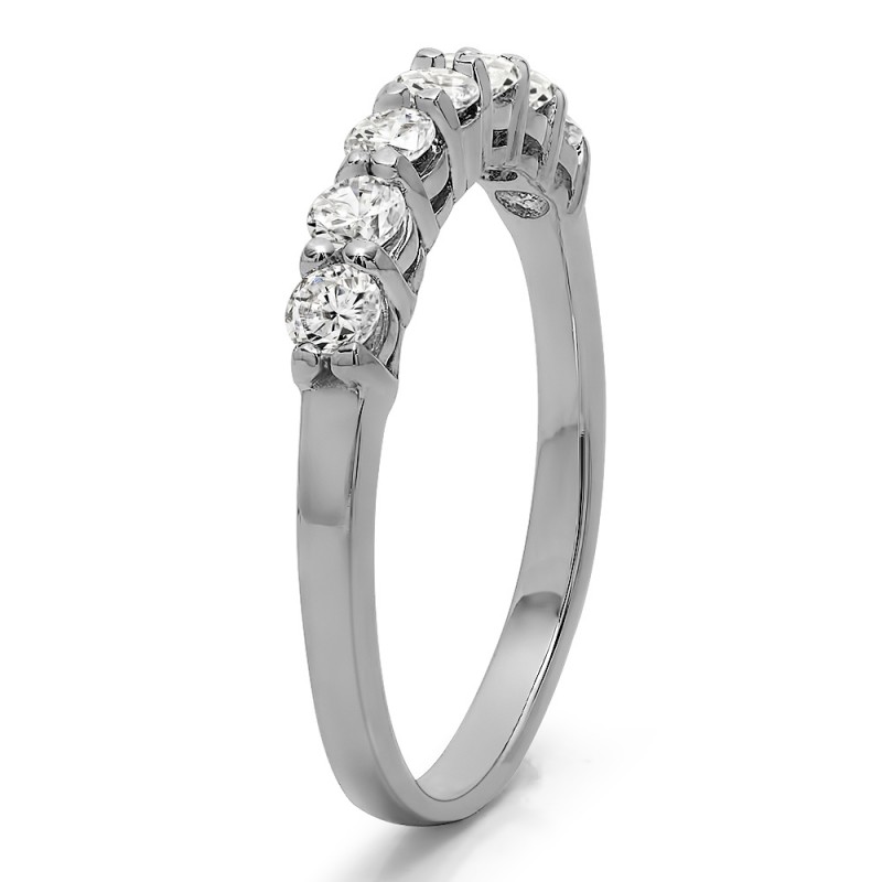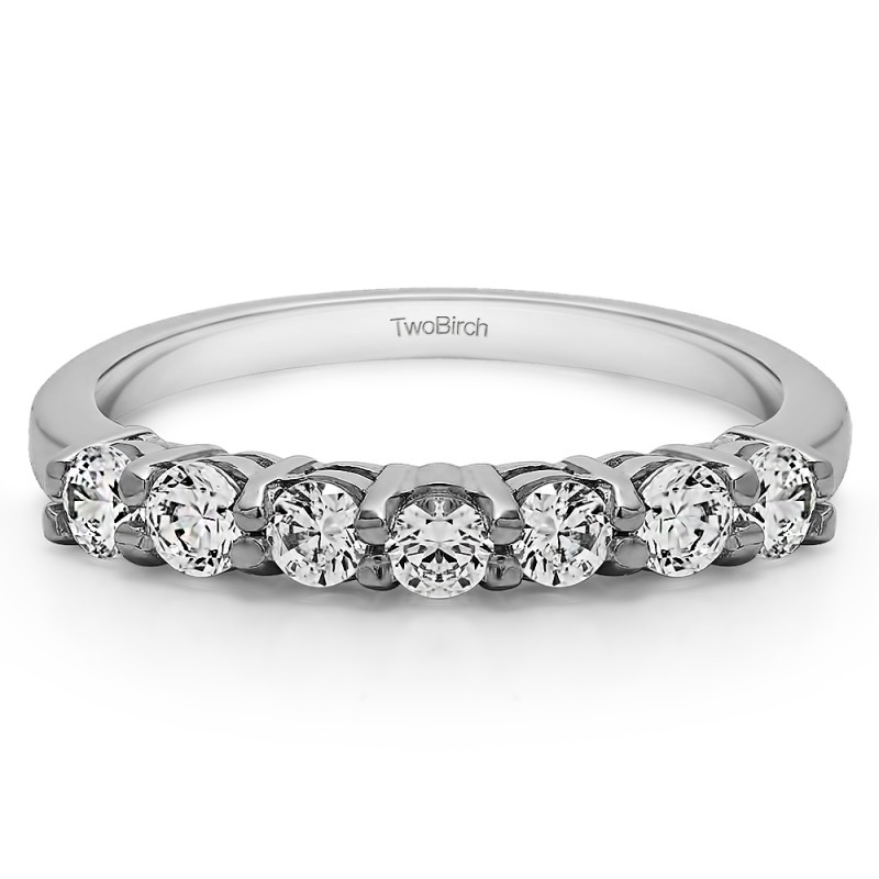 This wedding ring features 7 round prong set stones with a 2 millimeter wide band. The total combined carat weight of the ring is 0.42 carats. It has basket style settings. This wedding ring weighs approximately 2.79 grams.