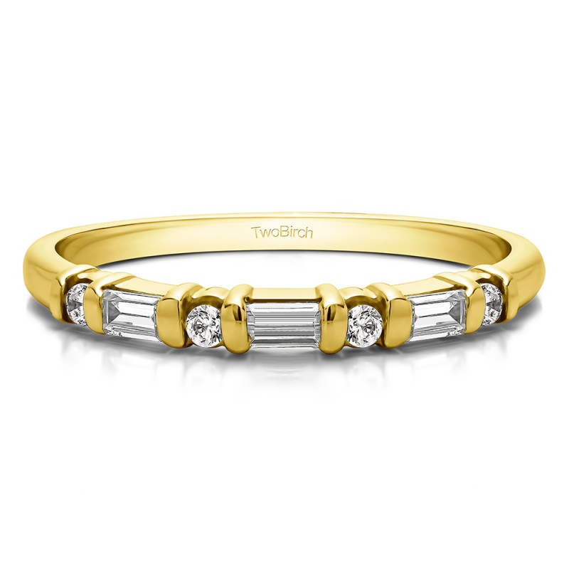 This wedding ring features 7 round and baguette bar set stones with a 3 millimeter wide band. The total combined carat weight of the ring is 0.45 carats. It alternates between round and baguette bar set stones. This wedding ring weighs approximately 4.34 grams.