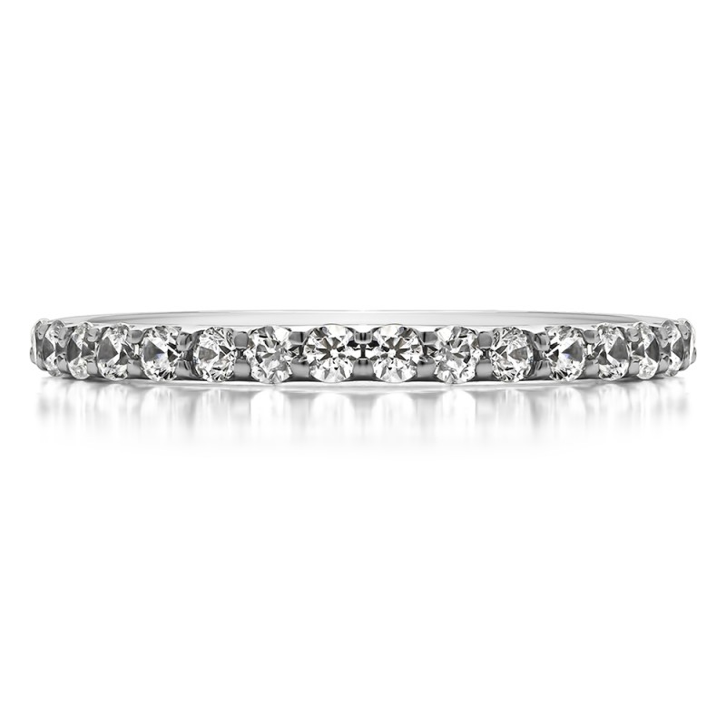 This wedding ring features 16 round prong set stones with a 2 millimeter wide band. The total combined carat weight of the ring is 0.48 carats. It has a high polish finish. This wedding ring weighs approximately 2.24 grams.